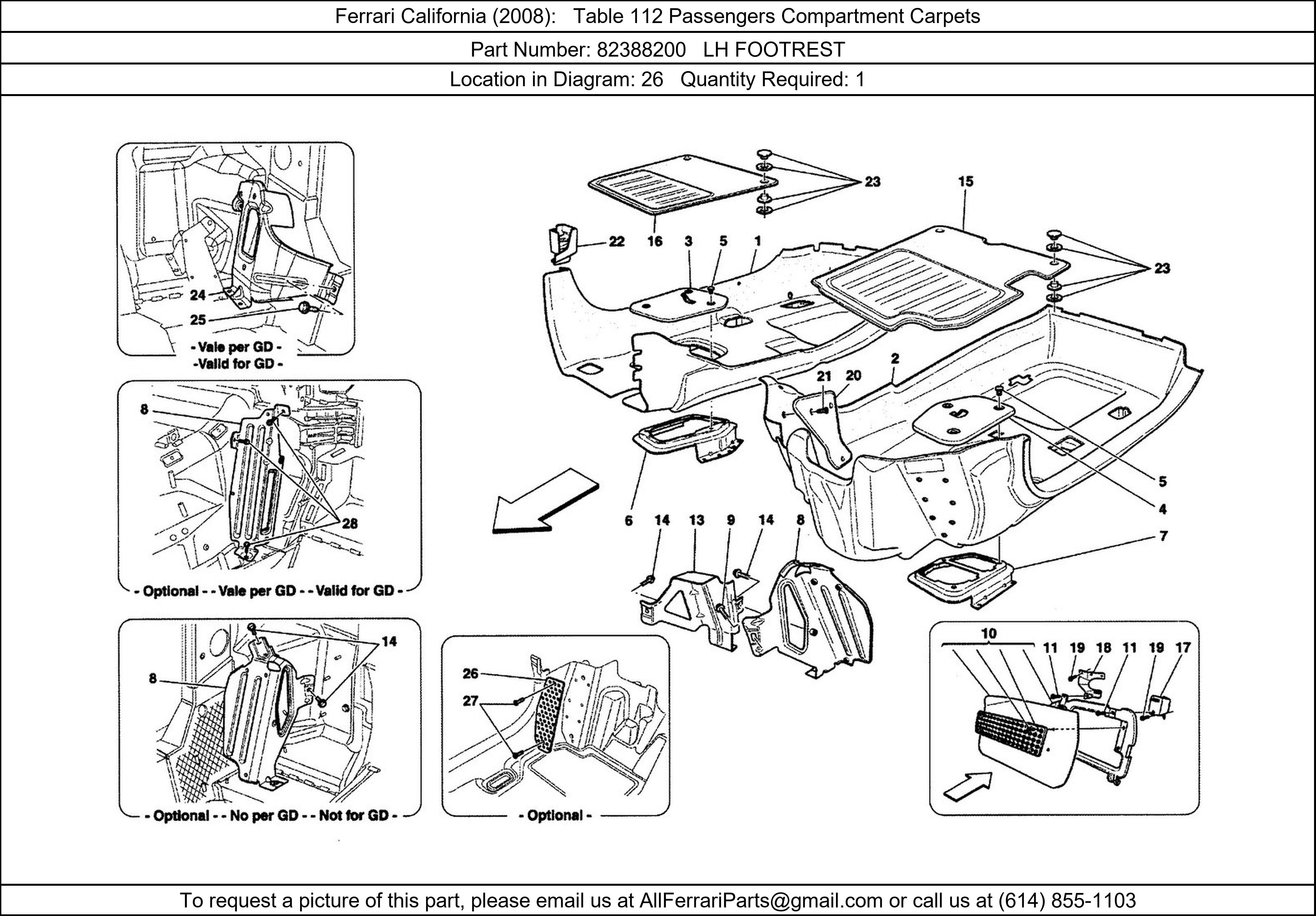 Ferrari Part 82388200, LH FOOTREST, shown here as used in Ferrari California (2008) Table 112 Passengers Compartment Carpets. Other uses of this part are shown below: