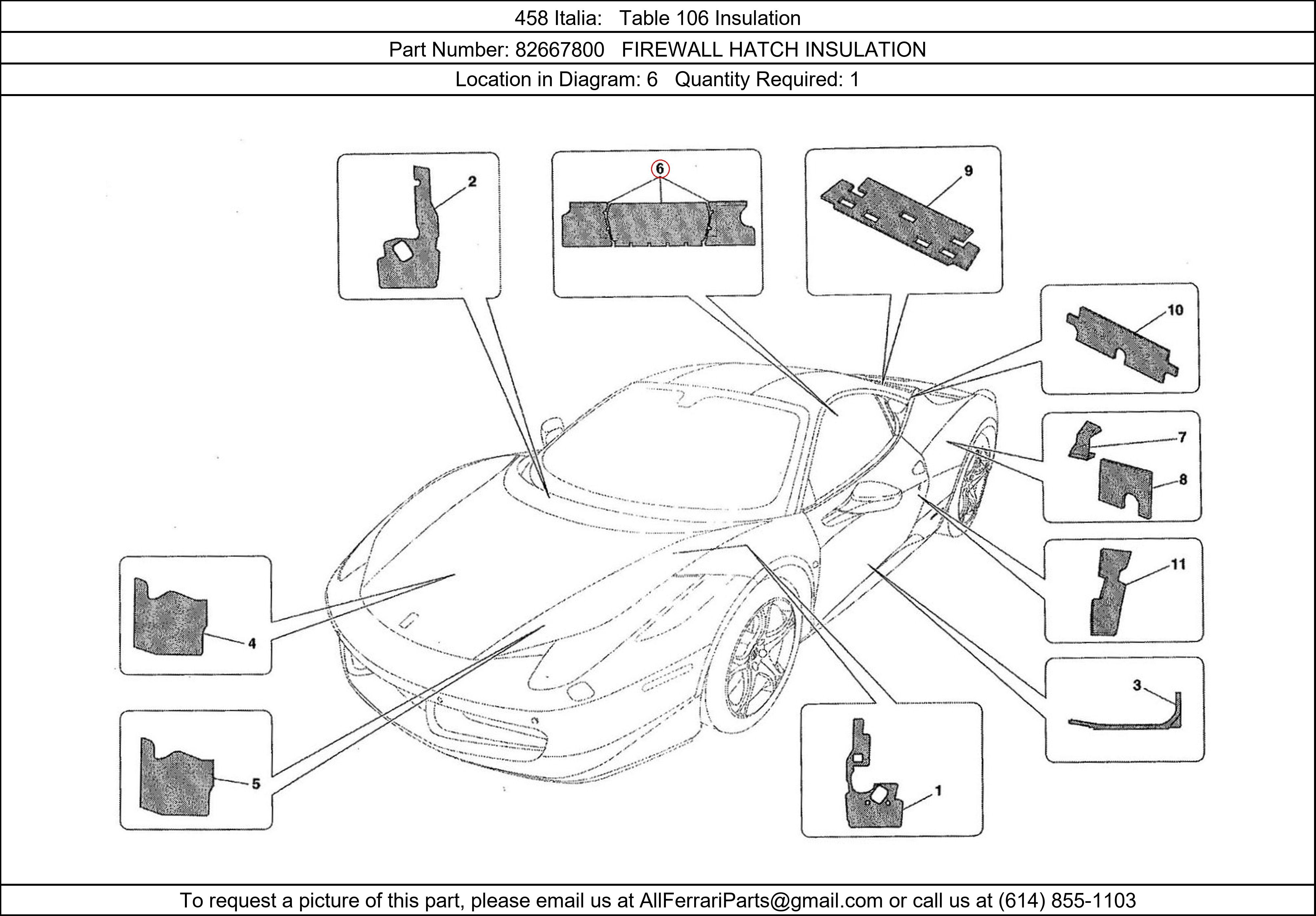 Ferrari Part Number 82667800, FIREWALL HATCH INSULATION shown here as used in 458 Italia Table 106 Insulation. Location in Diagram: 6. Required Quantity: 1. This Ferrari part is used in more than one diagram. Click on the diagrams below to see alternative uses of this part: