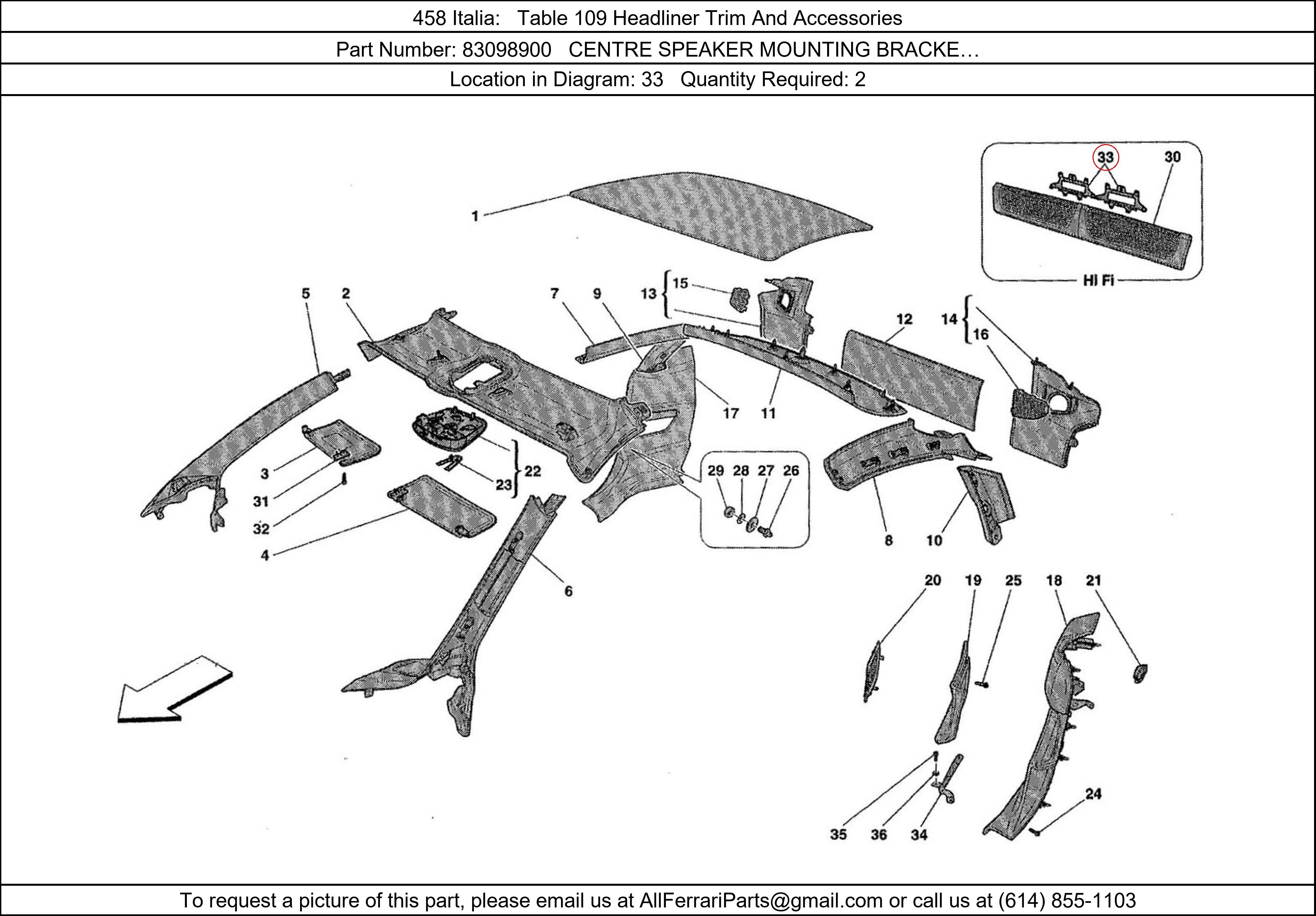 Ferrari Part Number 83098900, CENTRE SPEAKER MOUNTING BRACKE… shown here as used in 458 Italia Table 109 Headliner Trim And Accessories. Location in Diagram: 33. Required Quantity: 2