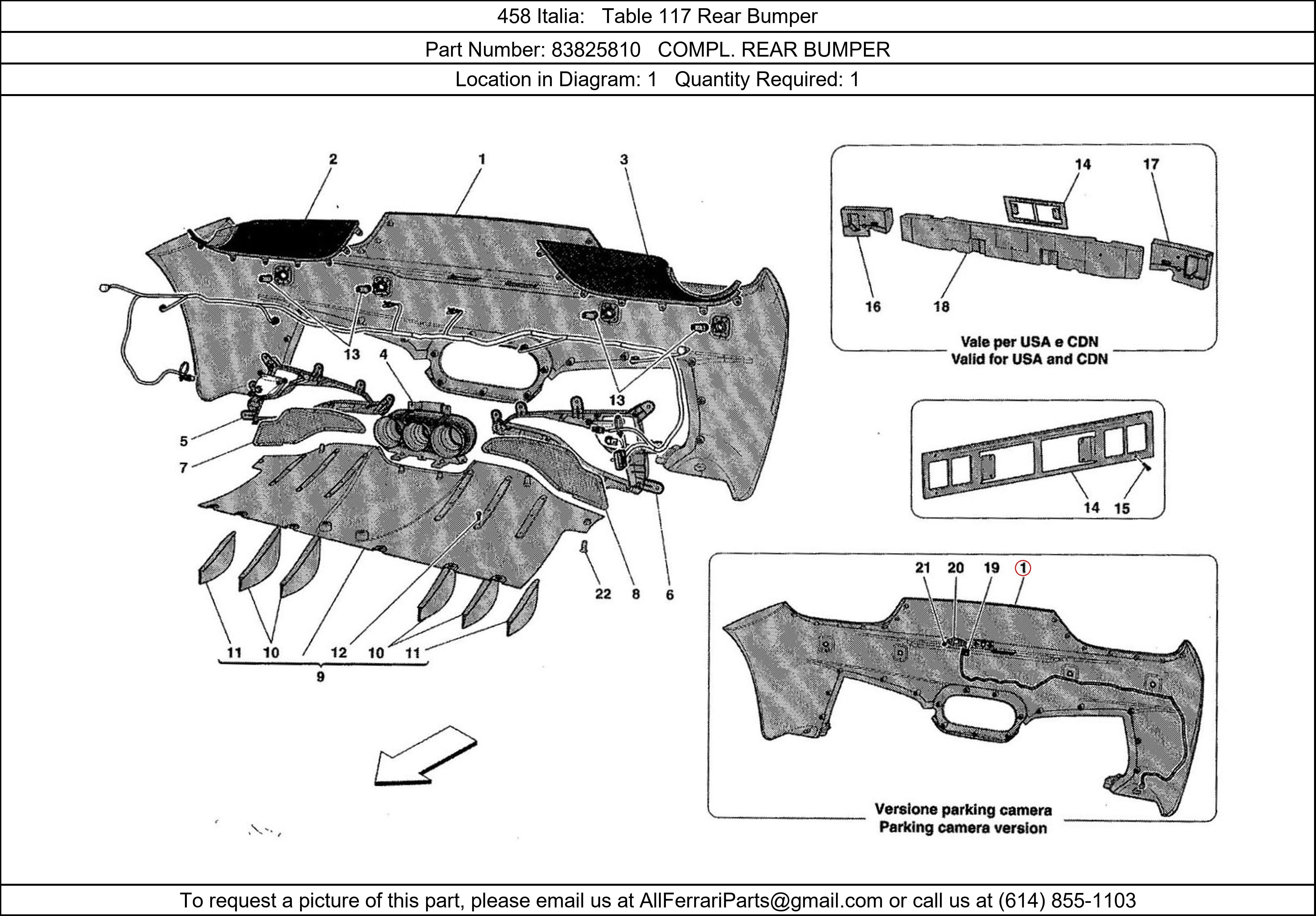 Ferrari Part Number 83825810, COMPL. REAR BUMPER shown here as used in 458 Italia Table 117 Rear Bumper. Location in Diagram: 1. Required Quantity: 1. This Ferrari part is used in more than one diagram. Click on the diagrams below to see alternative uses of this part: