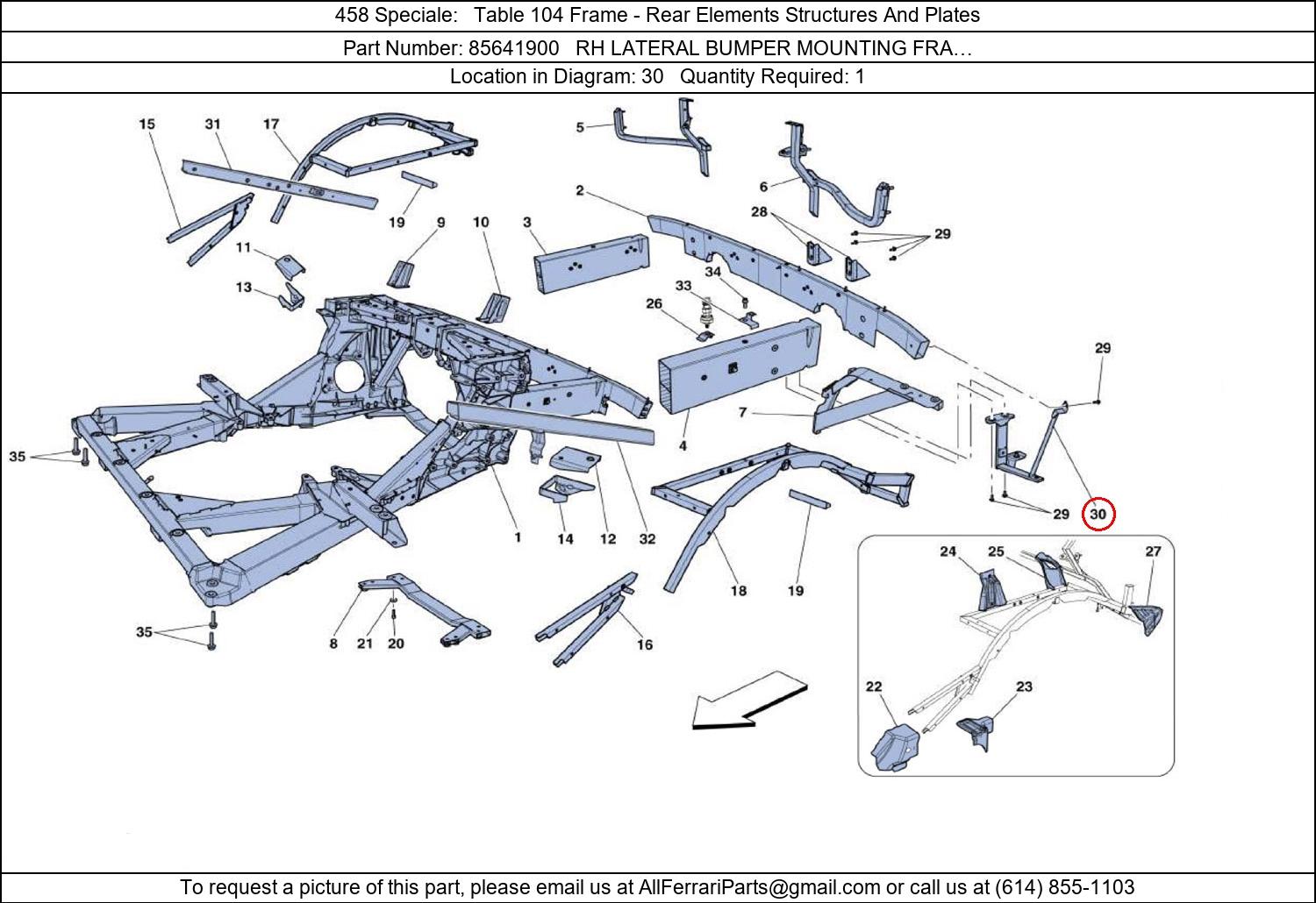 Ferrari Part Number 85641900, RH LATERAL BUMPER MOUNTING FRA… shown here as used in 458 Speciale Table 104 Frame - Rear Elements Structures And Plates. Location in Diagram: 30. Required Quantity: 1