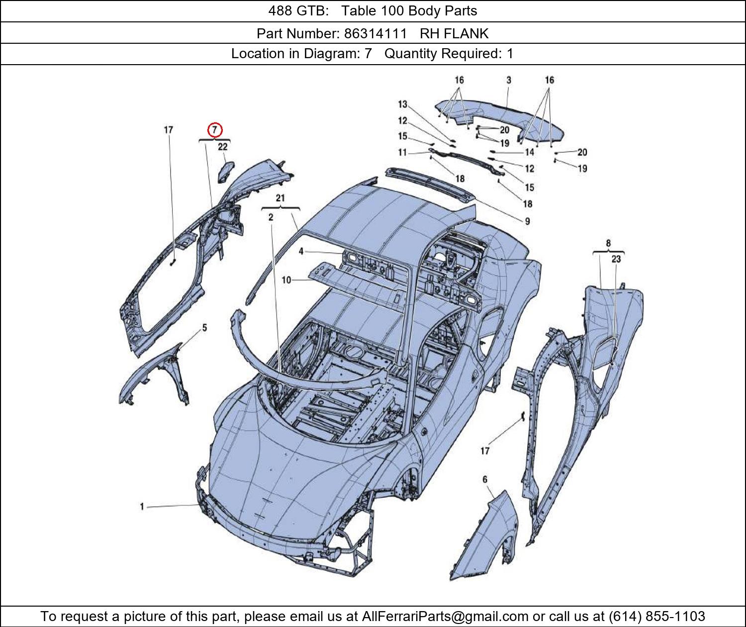Ferrari Part Number 86314111, RH FLANK shown here as used in 488 GTB Table 100 Body Parts. Location in Diagram: 7. Required Quantity: 1