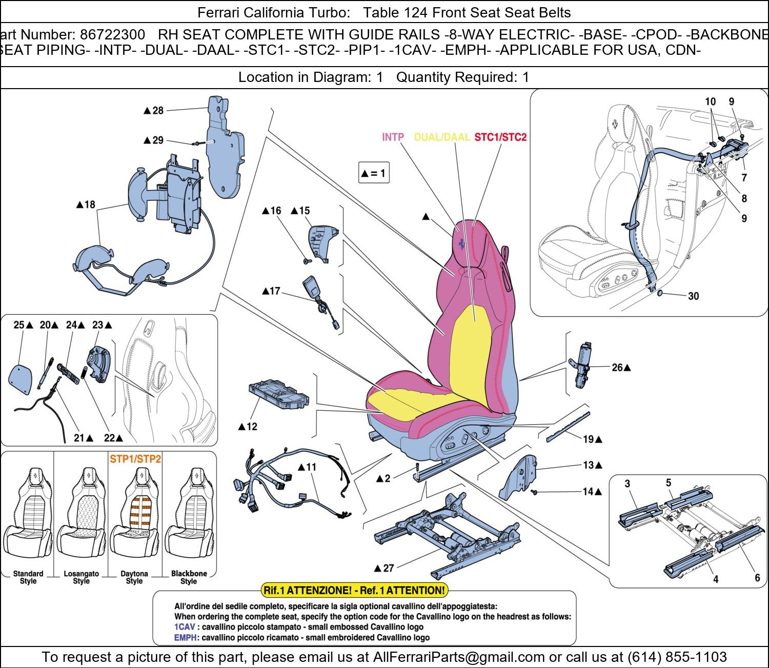 Ferrari part 86722300 RH SEAT COMPLETE WITH GUIDE RAILS -8-WAY ELECTRIC- -BASE- -CPOD- -BACKBONE- -SEAT PIPING- -INTP- -DUAL- -DAAL- -STC1- -STC2- -PIP1- -1CAV- -EMPH- -APPLICABLE FOR USA, CDN- shown here as used in Ferrari California Turbo (Table 124 - Front Seat - Seat Belts). Location in Diagram: 1. Required Quantity: 1