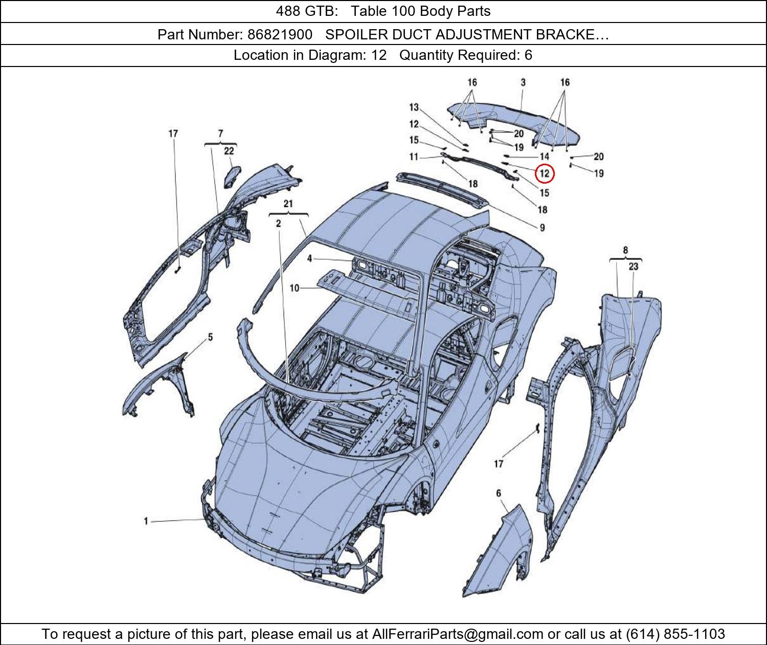 Ferrari Part Number 86821900, SPOILER DUCT ADJUSTMENT BRACKE… shown here as used in 488 GTB Table 100 Body Parts. Location in Diagram: 12. Required Quantity: 6