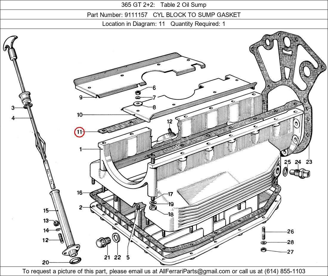Ferrari Part Number 9111157, CYL BLOCK TO SUMP GASKET shown here as used in 365 GT 2+2 Table 2 Oil Sump. Location in Diagram: 11. Required Quantity: 1. This Ferrari part is used in more than one diagram. Click on the diagrams below to see alternative uses of this part: