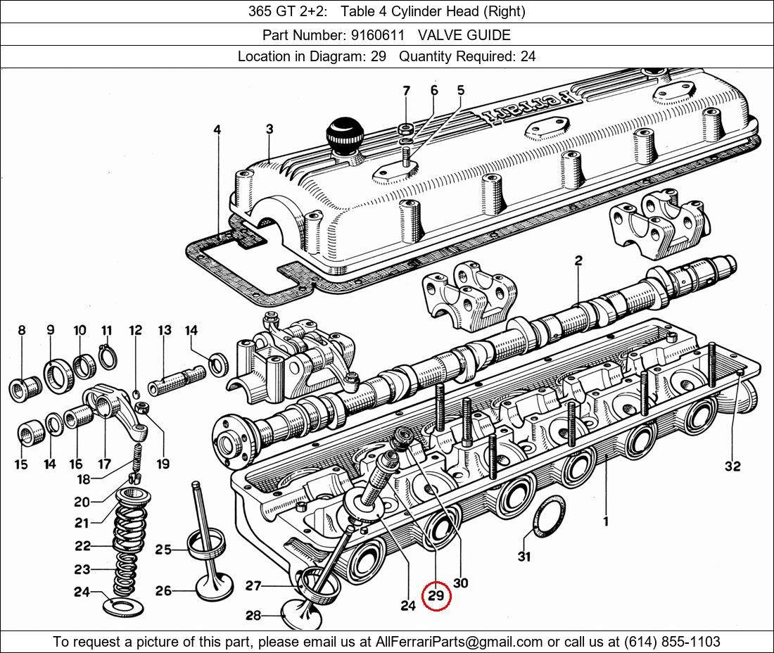 Ferrari Part Number 9160611, VALVE GUIDE shown here as used in 365 GT 2+2 Table 4 Cylinder Head (Right). Location in Diagram: 29. Required Quantity: 24