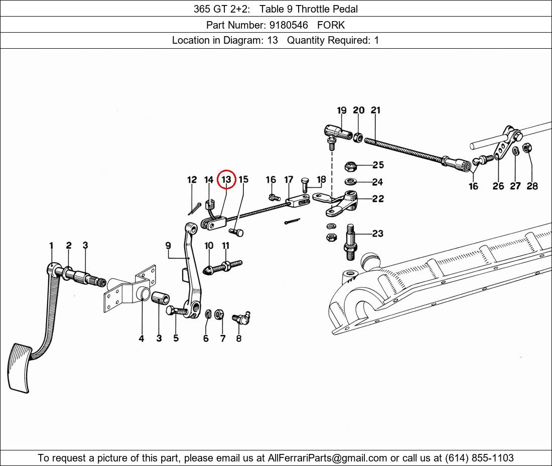 Ferrari Part Number 9180546, FORK shown here as used in 365 GT 2+2 Table 9 Throttle Pedal. Location in Diagram: 13. Required Quantity: 1