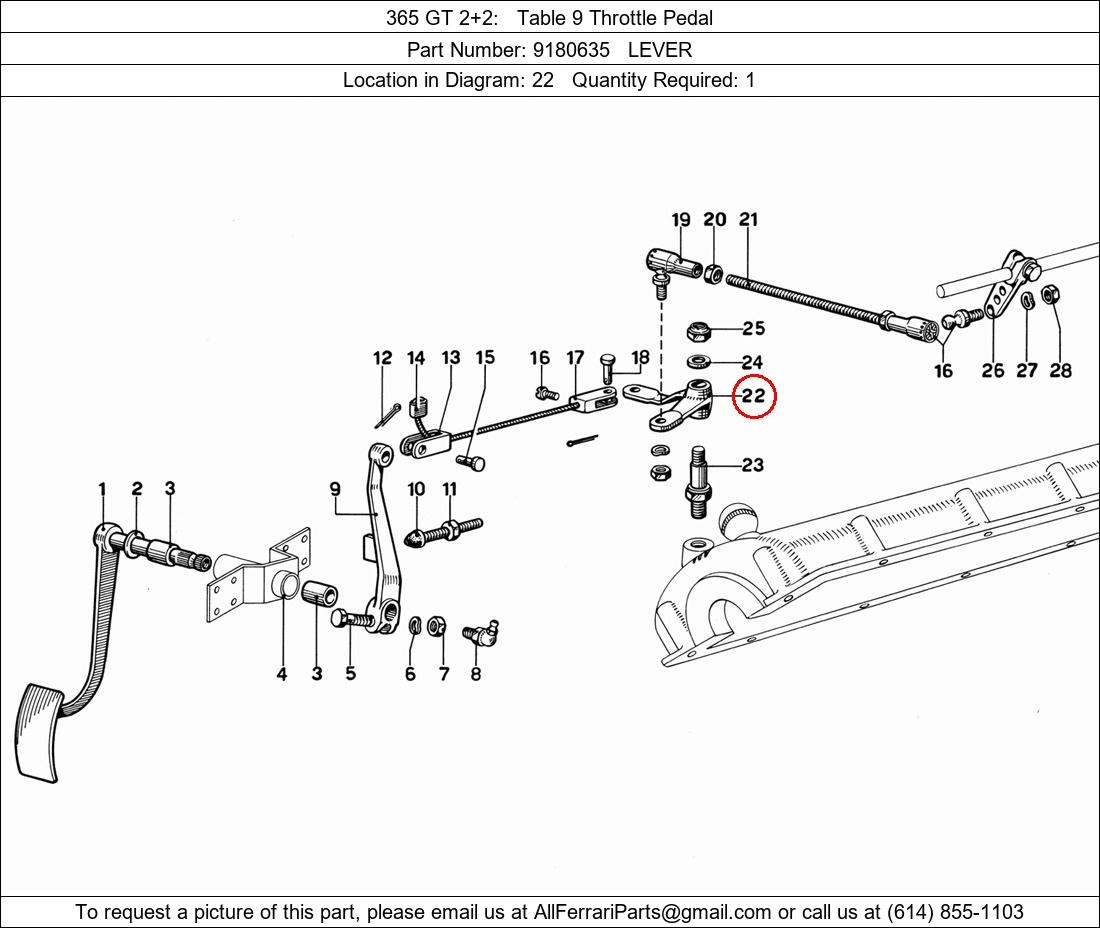 Ferrari Part Number 9180635, LEVER shown here as used in 365 GT 2+2 Table 9 Throttle Pedal. Location in Diagram: 22. Required Quantity: 1