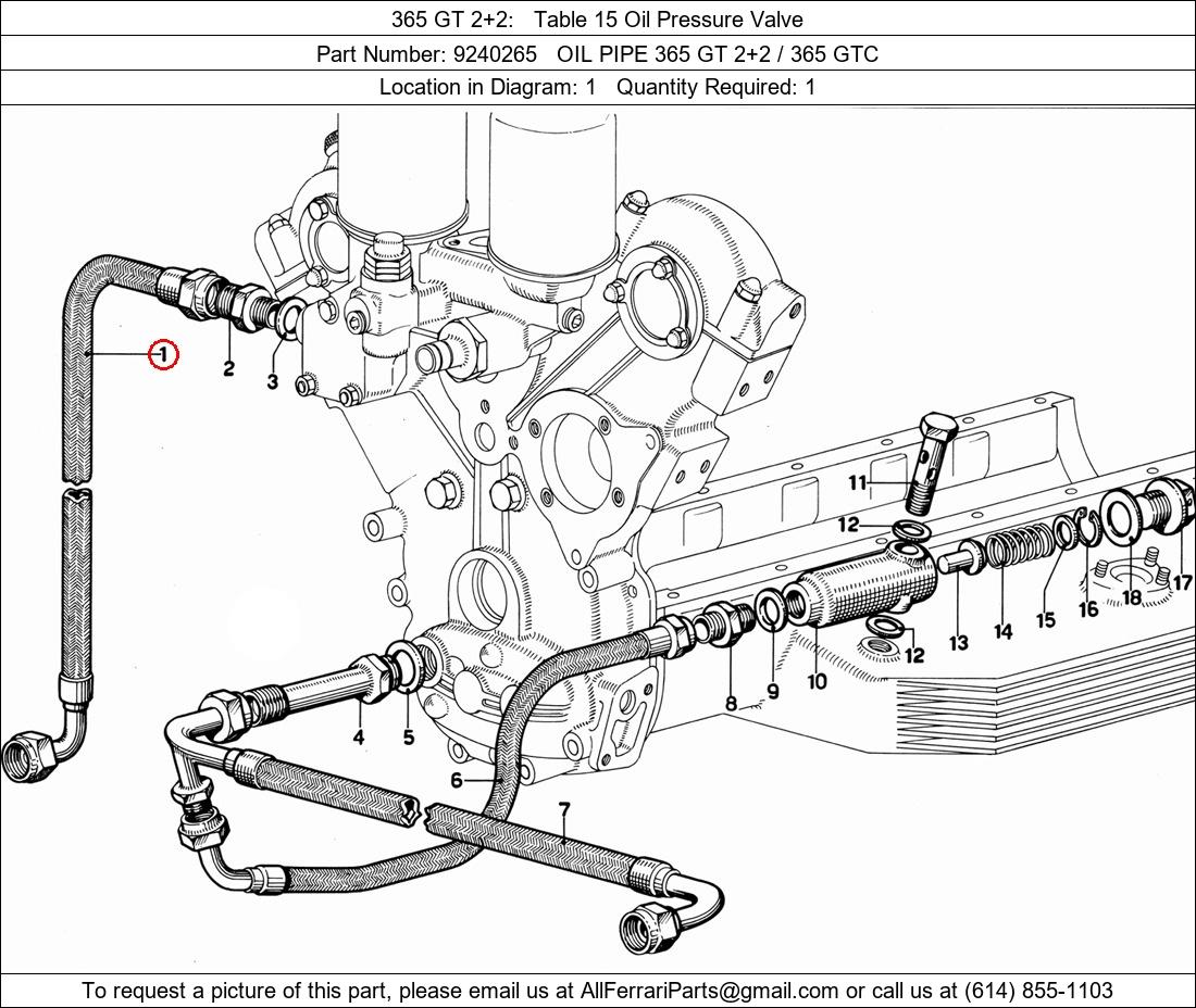 Ferrari Part Number 9240265, OIL PIPE 365 GT 2+2 / 365 GTC shown here as used in 365 GT 2+2 Table 15 Oil Pressure Valve. Location in Diagram: 1. Required Quantity: 1. This Ferrari part is used in more than one diagram. Click on the diagrams below to see alternative uses of this part: