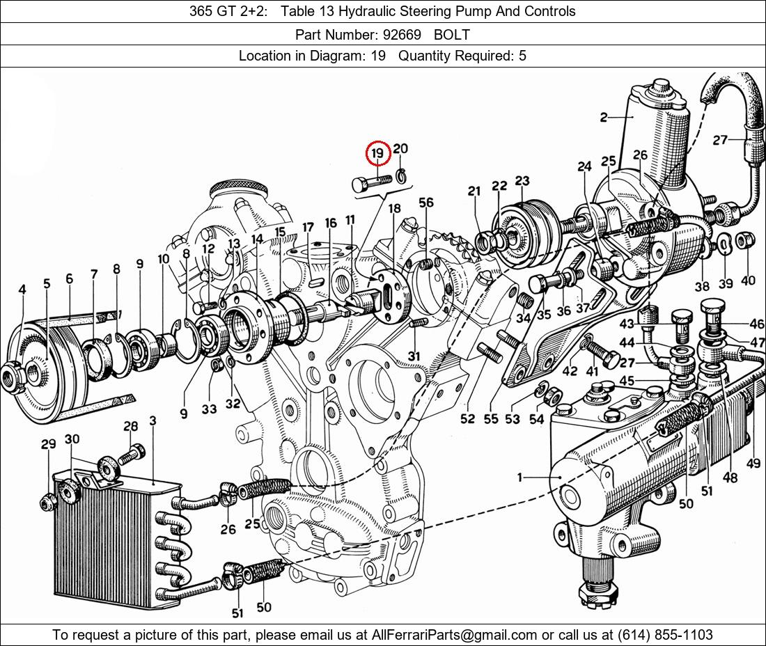 Ferrari Part Number 92669, BOLT shown here as used in 365 GT 2+2 Table 13 Hydraulic Steering Pump And Controls. Location in Diagram: 19. Required Quantity: 5. This Ferrari part is used in more than one diagram. Click on the diagrams below to see alternative uses of this part: