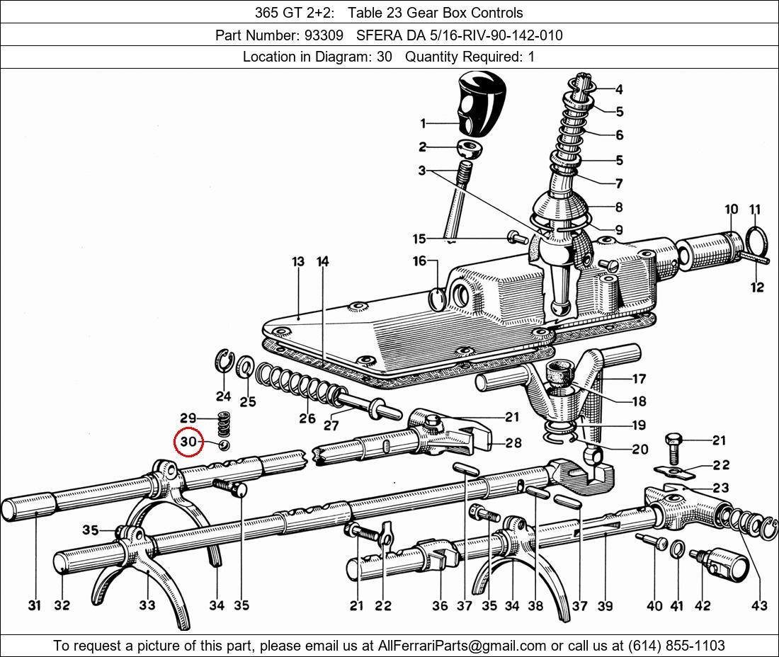 Ferrari Part Number 93309, SFERA DA 5/16-RIV-90-142-010 shown here as used in 365 GT 2+2 Table 23 Gear Box Controls. Location in Diagram: 30. Required Quantity: 1. This Ferrari part is used in more than one diagram. Click on the diagrams below to see alternative uses of this part: