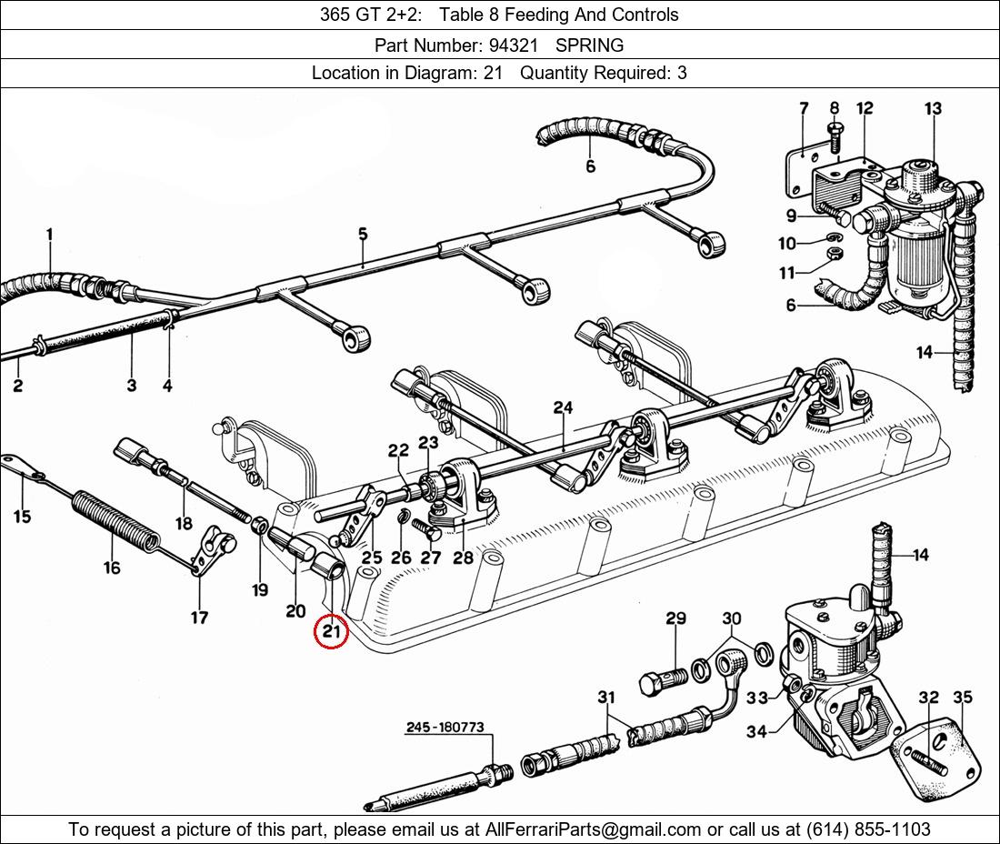 Ferrari Part Number 94321, SPRING shown here as used in 365 GT 2+2 Table 8 Feeding And Controls. Location in Diagram: 21. Required Quantity: 3. This Ferrari part is used in more than one diagram. Click on the diagrams below to see alternative uses of this part: