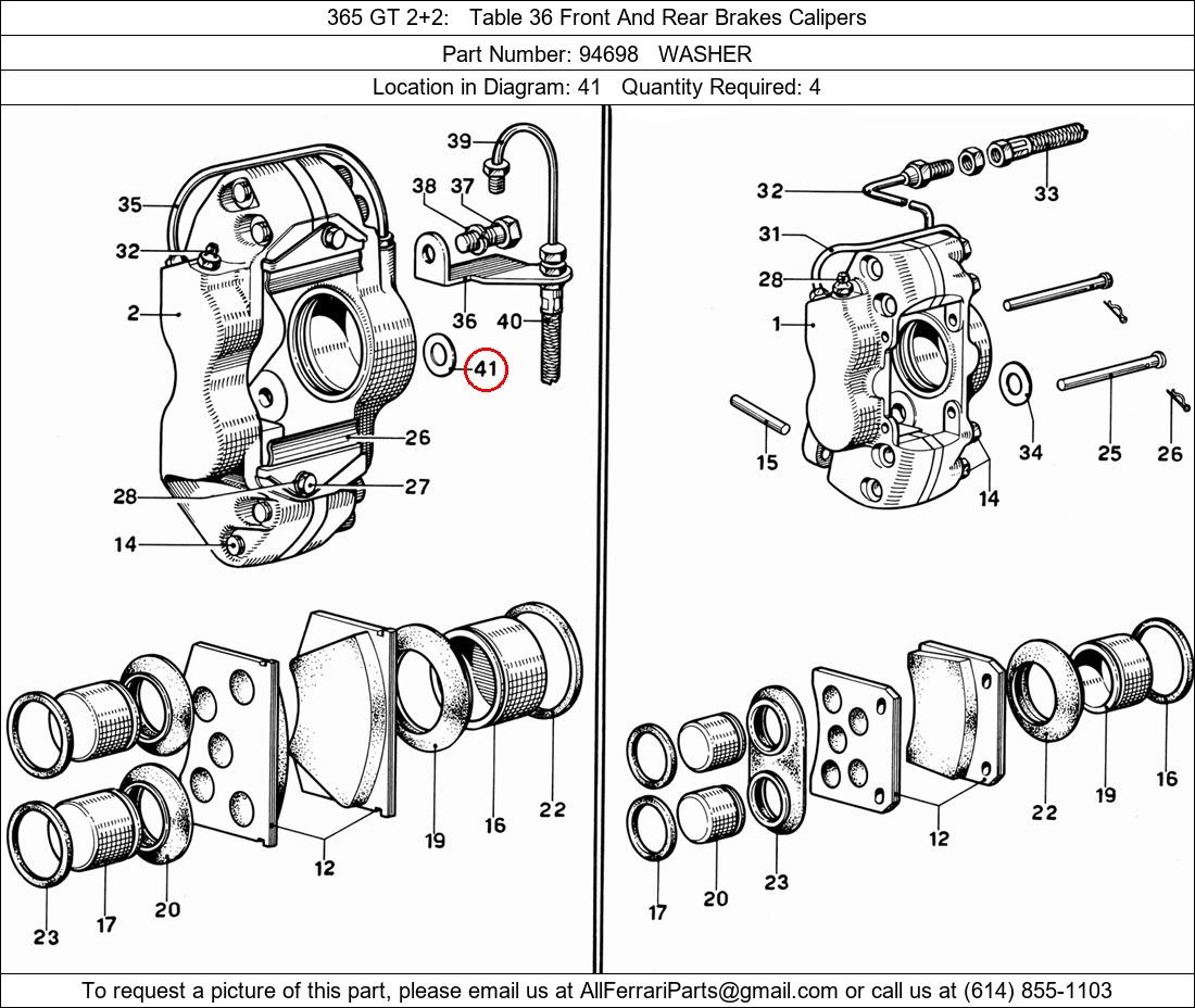 Ferrari Part Number 94698, WASHER shown here as used in 365 GT 2+2 Table 36 Front And Rear Brakes Calipers. Location in Diagram: 41. Required Quantity: 4