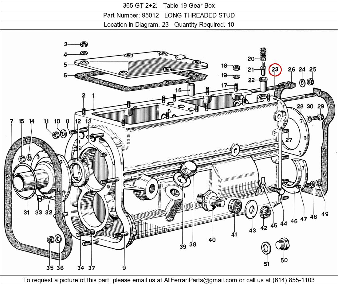 Ferrari Part Number 95012, LONG THREADED STUD shown here as used in 365 GT 2+2 Table 19 Gear Box. Location in Diagram: 23. Required Quantity: 10