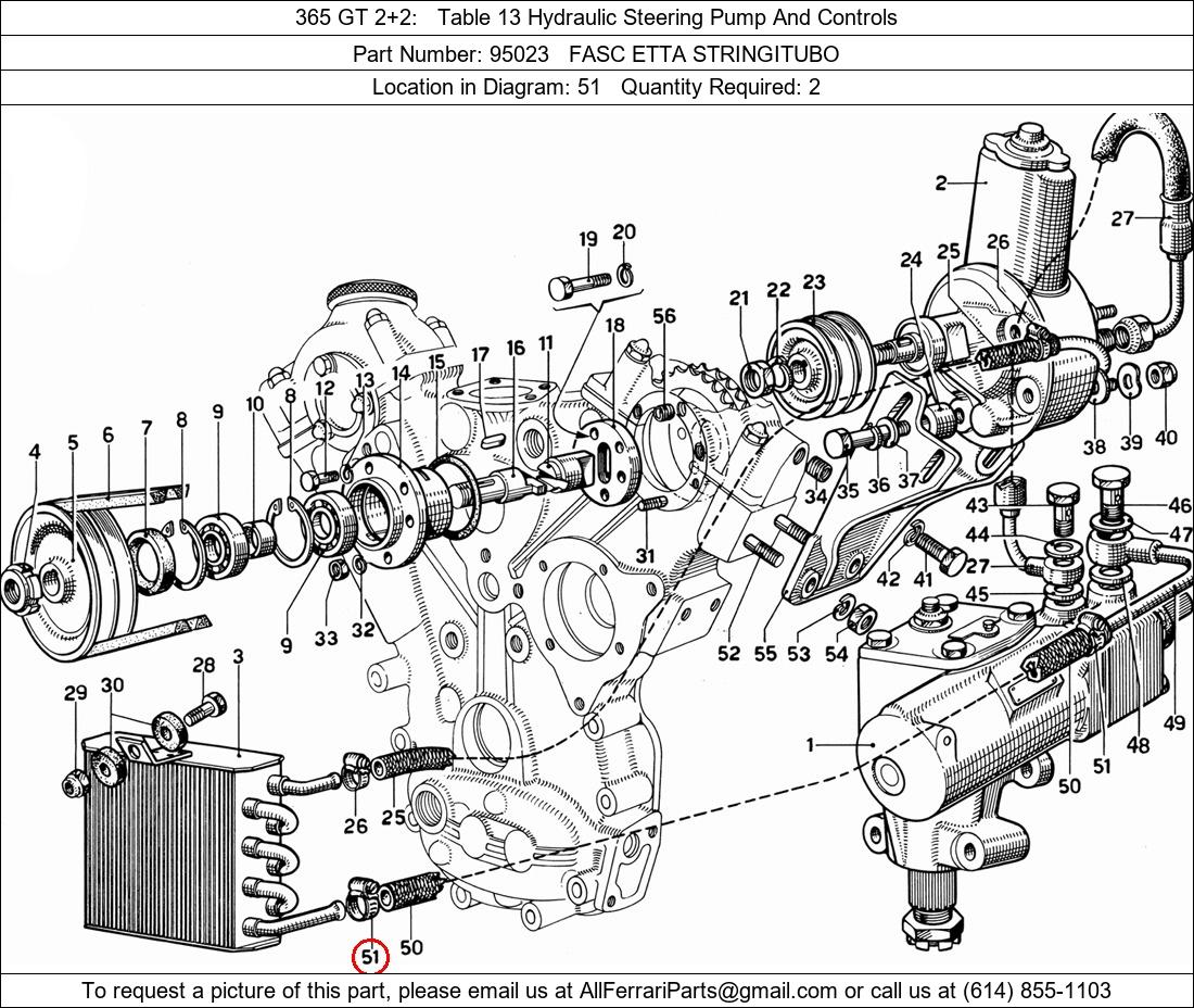 Ferrari Part Number 95023, FASC ETTA STRINGITUBO shown here as used in 365 GT 2+2 Table 13 Hydraulic Steering Pump And Controls. Location in Diagram: 51. Required Quantity: 2
