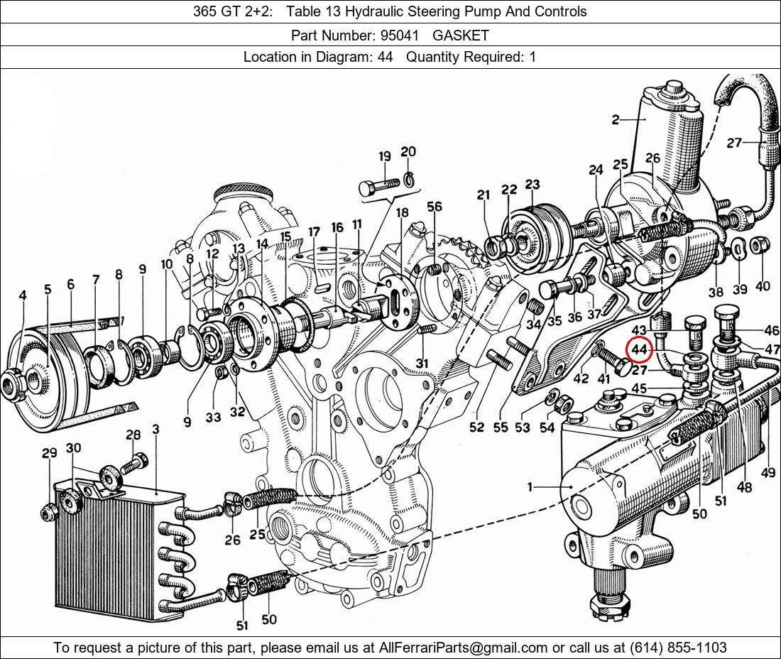 Ferrari Part Number 95041, GASKET shown here as used in 365 GT 2+2 Table 13 Hydraulic Steering Pump And Controls. Location in Diagram: 44. Required Quantity: 1. This Ferrari part is used in more than one diagram. Click on the diagrams below to see alternative uses of this part: