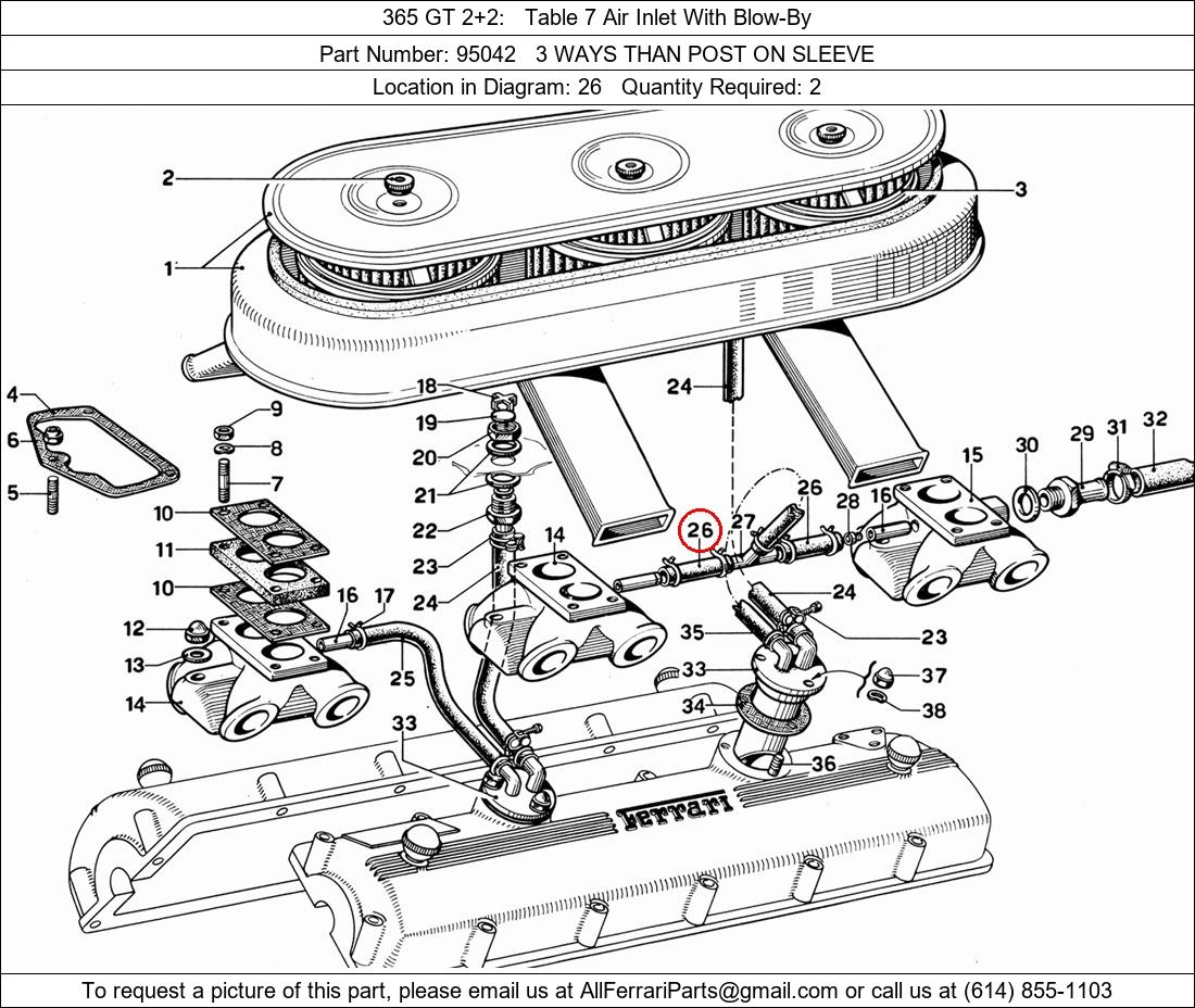Ferrari Part Number 95042, 3 WAYS THAN POST ON SLEEVE shown here as used in 365 GT 2+2 Table 7 Air Inlet With Blow-By. Location in Diagram: 26. Required Quantity: 2. This Ferrari part is used in more than one diagram. Click on the diagrams below to see alternative uses of this part: