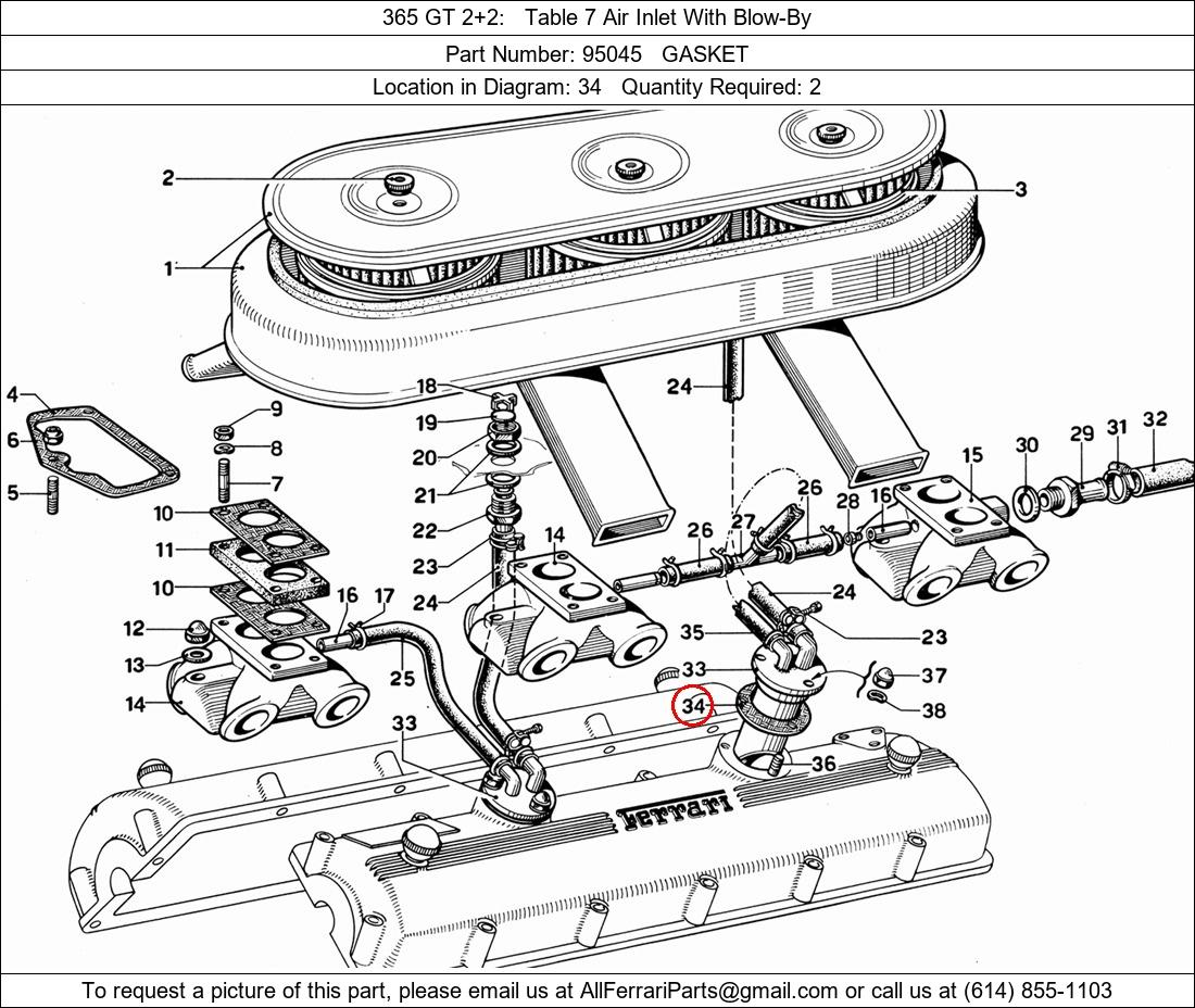 Ferrari Part Number 95045, GASKET shown here as used in 365 GT 2+2 Table 7 Air Inlet With Blow-By. Location in Diagram: 34. Required Quantity: 2. This Ferrari part is used in more than one diagram. Click on the diagrams below to see alternative uses of this part: