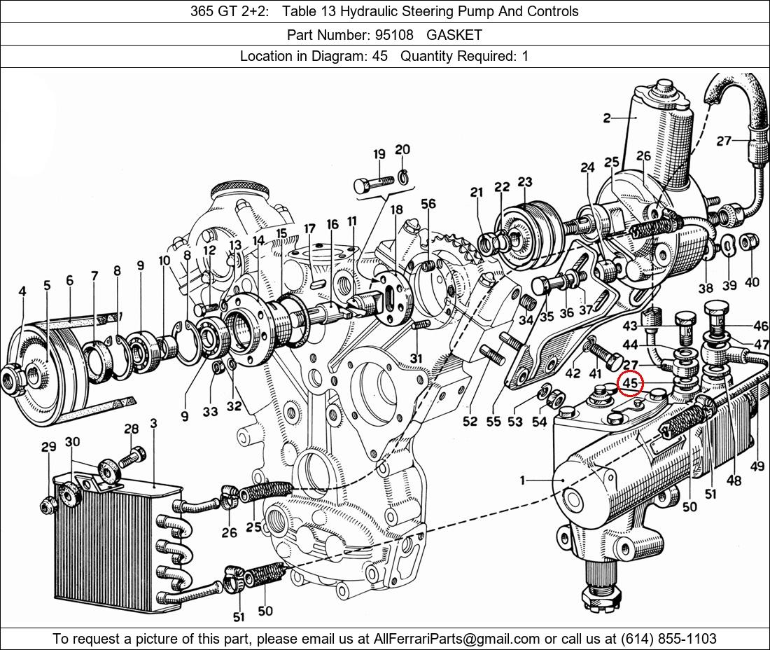 Ferrari Part Number 95108, GASKET shown here as used in 365 GT 2+2 Table 13 Hydraulic Steering Pump And Controls. Location in Diagram: 45. Required Quantity: 1. This Ferrari part is used in more than one diagram. Click on the diagrams below to see alternative uses of this part: