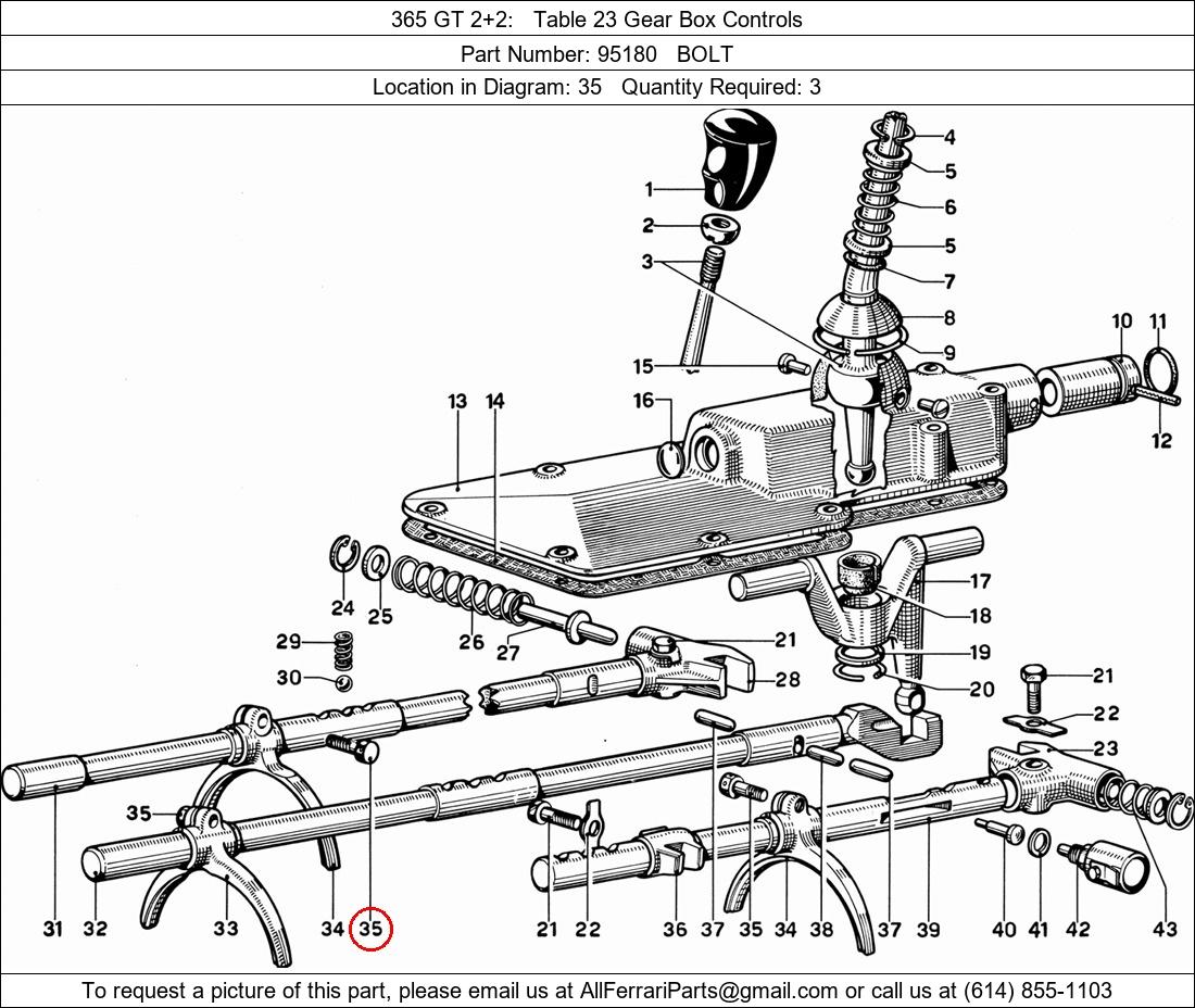 Ferrari Part Number 95180, BOLT shown here as used in 365 GT 2+2 Table 23 Gear Box Controls. Location in Diagram: 35. Required Quantity: 3. This Ferrari part is used in more than one diagram. Click on the diagrams below to see alternative uses of this part:
