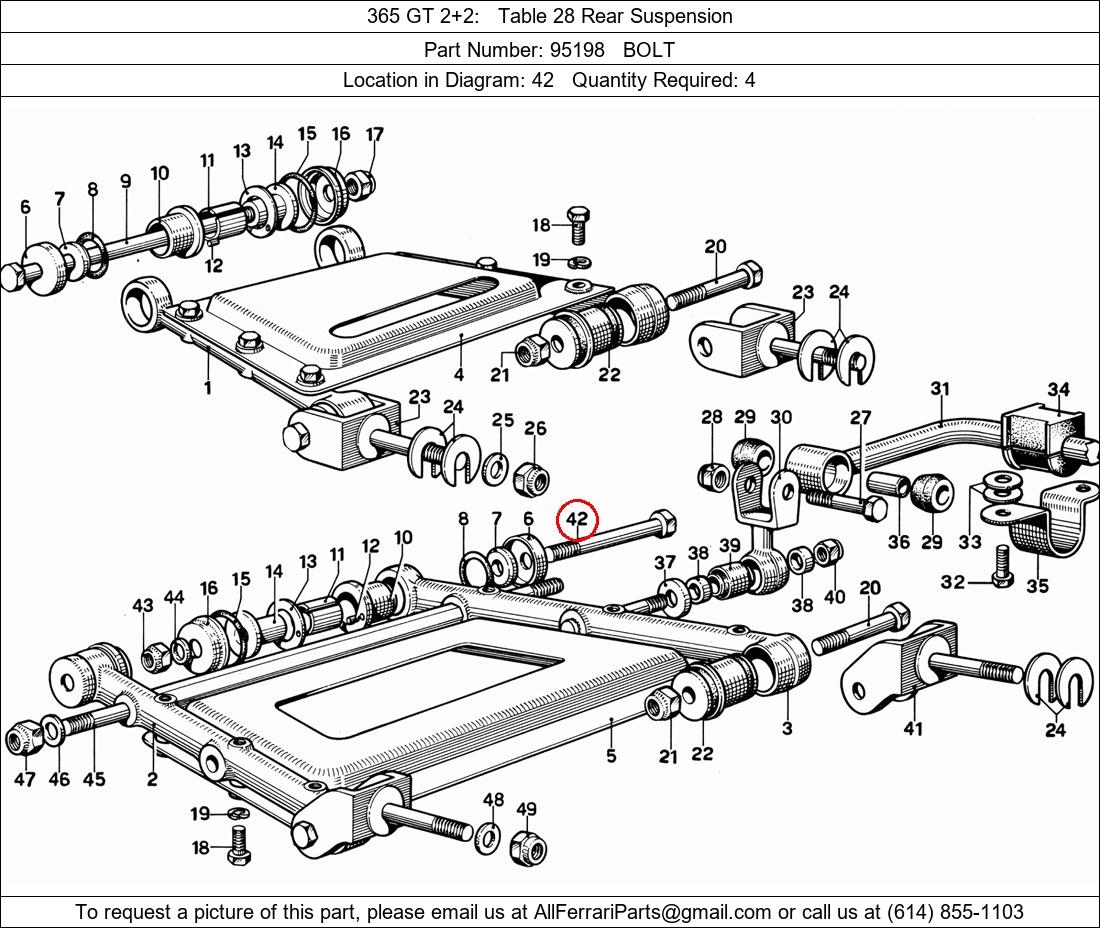 Ferrari Part Number 95198, BOLT shown here as used in 365 GT 2+2 Table 28 Rear Suspension. Location in Diagram: 42. Required Quantity: 4