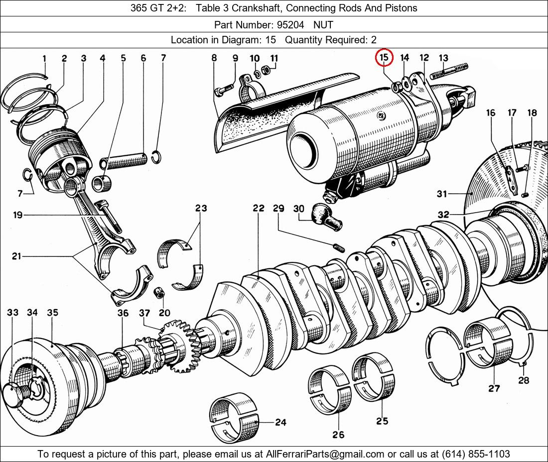 Ferrari Part Number 95204, NUT shown here as used in 365 GT 2+2 Table 3 Crankshaft, Connecting Rods And Pistons. Location in Diagram: 15. Required Quantity: 2. This Ferrari part is used in more than one diagram. Click on the diagrams below to see alternative uses of this part: