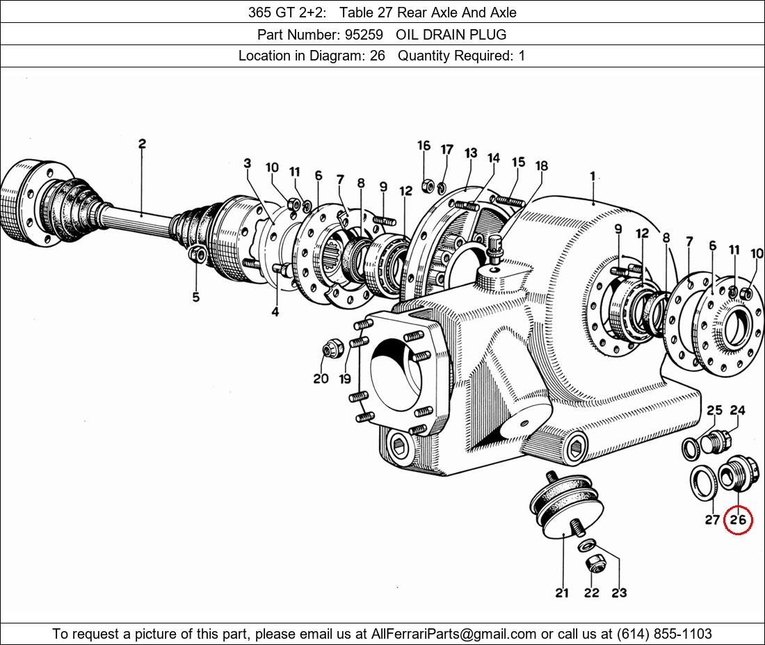Ferrari Part Number 95259, OIL DRAIN PLUG shown here as used in 365 GT 2+2 Table 27 Rear Axle And Axle. Location in Diagram: 26. Required Quantity: 1