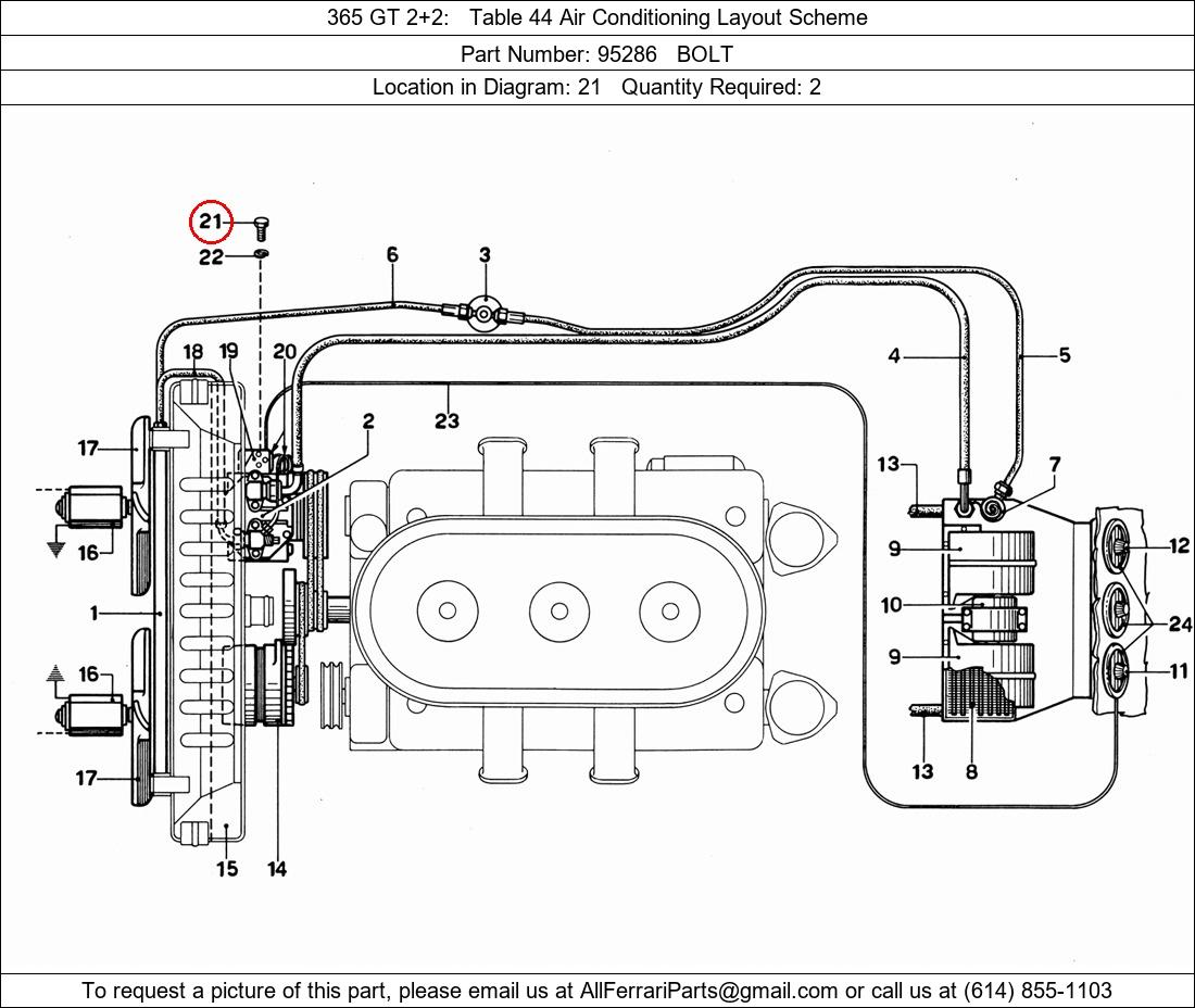 Ferrari Part Number 95286, BOLT shown here as used in 365 GT 2+2 Table 44 Air Conditioning Layout Scheme. Location in Diagram: 21. Required Quantity: 2. This Ferrari part is used in more than one diagram. Click on the diagrams below to see alternative uses of this part: