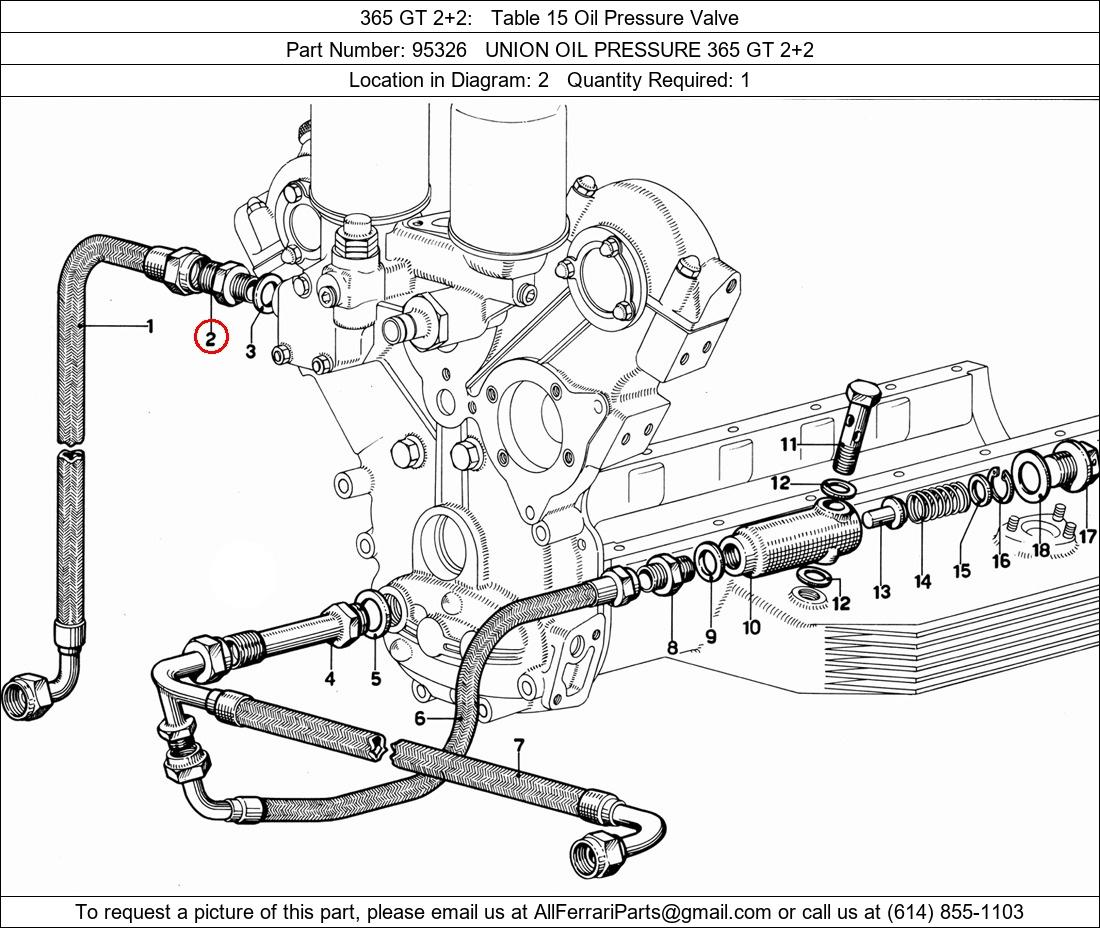 Ferrari Part Number 95326, UNION OIL PRESSURE 365 GT 2+2 shown here as used in 365 GT 2+2 Table 15 Oil Pressure Valve. Location in Diagram: 2. Required Quantity: 1