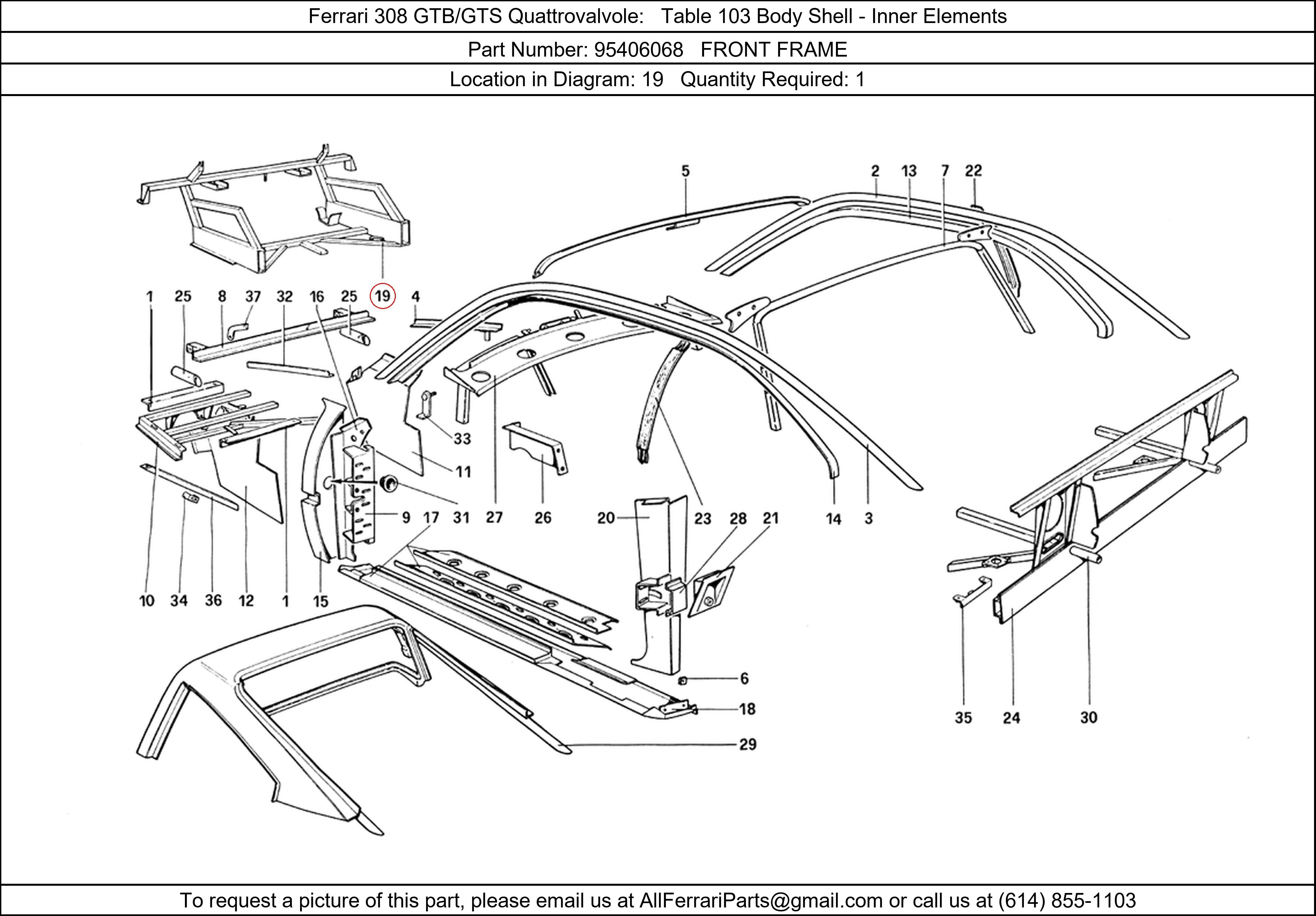 Ferrari Part Number 95406068, FRONT FRAME shown here as used in Ferrari 308 GTB/GTS Quattrovalvole Table 103 Body Shell - Inner Elements. Location in Diagram: 19. Required Quantity: 1