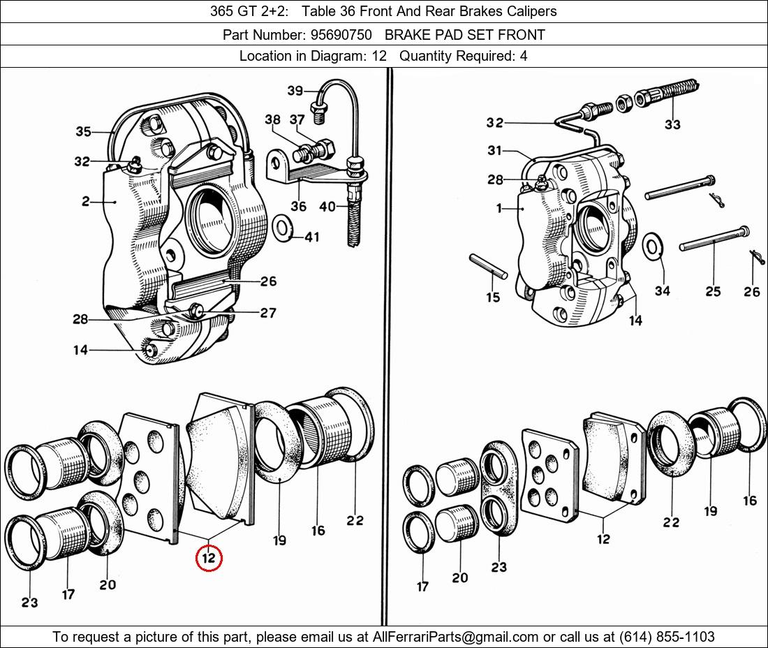 Ferrari Part Number 95690750, BRAKE PAD SET FRONT shown here as used in 365 GT 2+2 Table 36 Front And Rear Brakes Calipers. Location in Diagram: 12. Required Quantity: 4