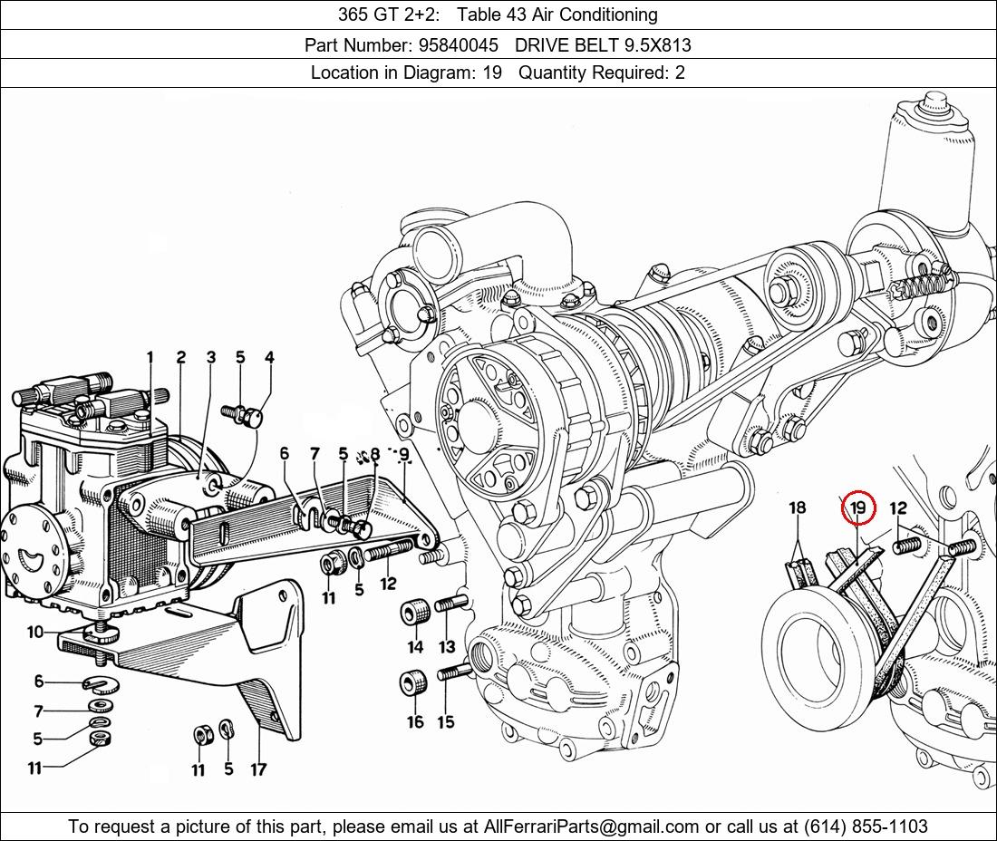 Ferrari Part Number 95840045, DRIVE BELT 9.5X813 shown here as used in 365 GT 2+2 Table 43 Air Conditioning. Location in Diagram: 19. Required Quantity: 2
