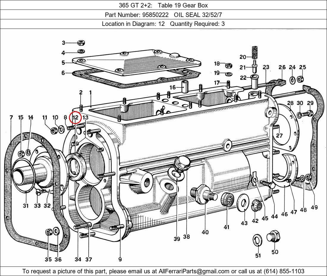 Ferrari Part Number 95850222, OIL SEAL 32/52/7 shown here as used in 365 GT 2+2 Table 19 Gear Box. Location in Diagram: 12. Required Quantity: 3
