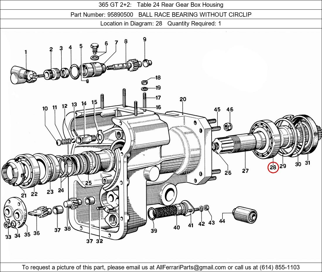 Ferrari Part Number 95890500, BALL RACE BEARING WITHOUT CIRCLIP shown here as used in 365 GT 2+2 Table 24 Rear Gear Box Housing. Location in Diagram: 28. Required Quantity: 1