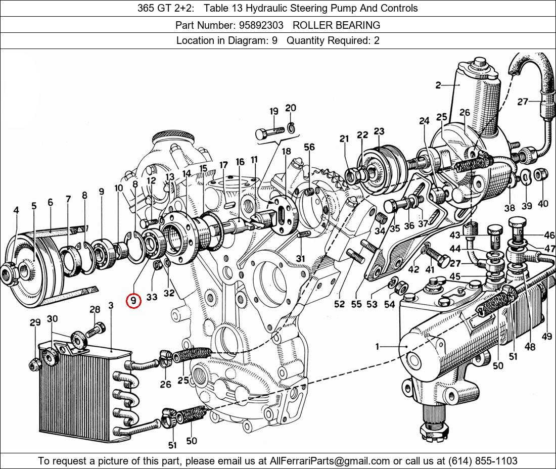 Ferrari Part Number 95892303, ROLLER BEARING shown here as used in 365 GT 2+2 Table 13 Hydraulic Steering Pump And Controls. Location in Diagram: 9. Required Quantity: 2