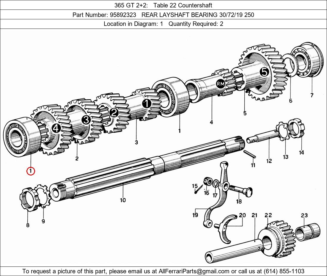 Ferrari Part Number 95892323, REAR LAYSHAFT BEARING 30/72/19 250 shown here as used in 365 GT 2+2 Table 22 Countershaft. Location in Diagram: 1. Required Quantity: 2. This Ferrari part is used in more than one diagram. Click on the diagrams below to see alternative uses of this part: