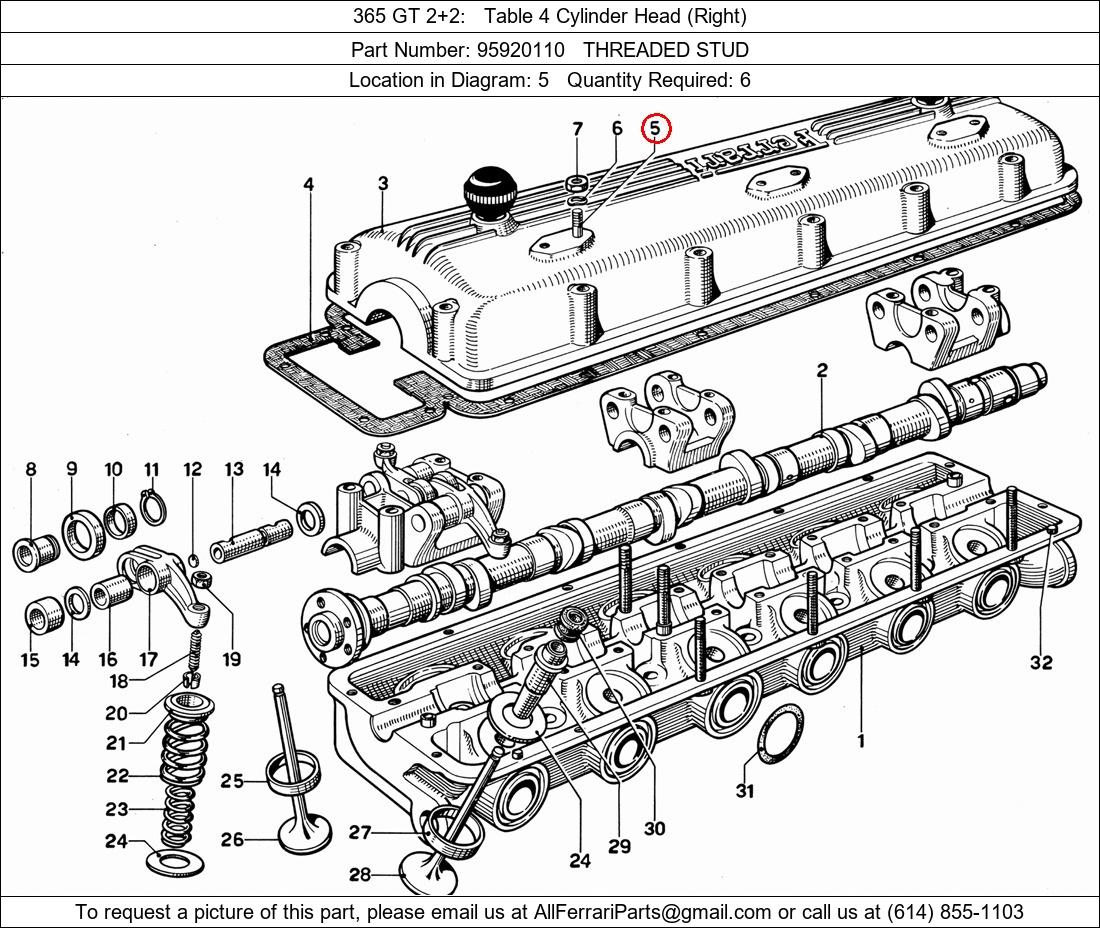 Ferrari Part Number 95920110, THREADED STUD shown here as used in 365 GT 2+2 Table 4 Cylinder Head (Right). Location in Diagram: 5. Required Quantity: 6. This Ferrari part is used in more than one diagram. Click on the diagrams below to see alternative uses of this part: