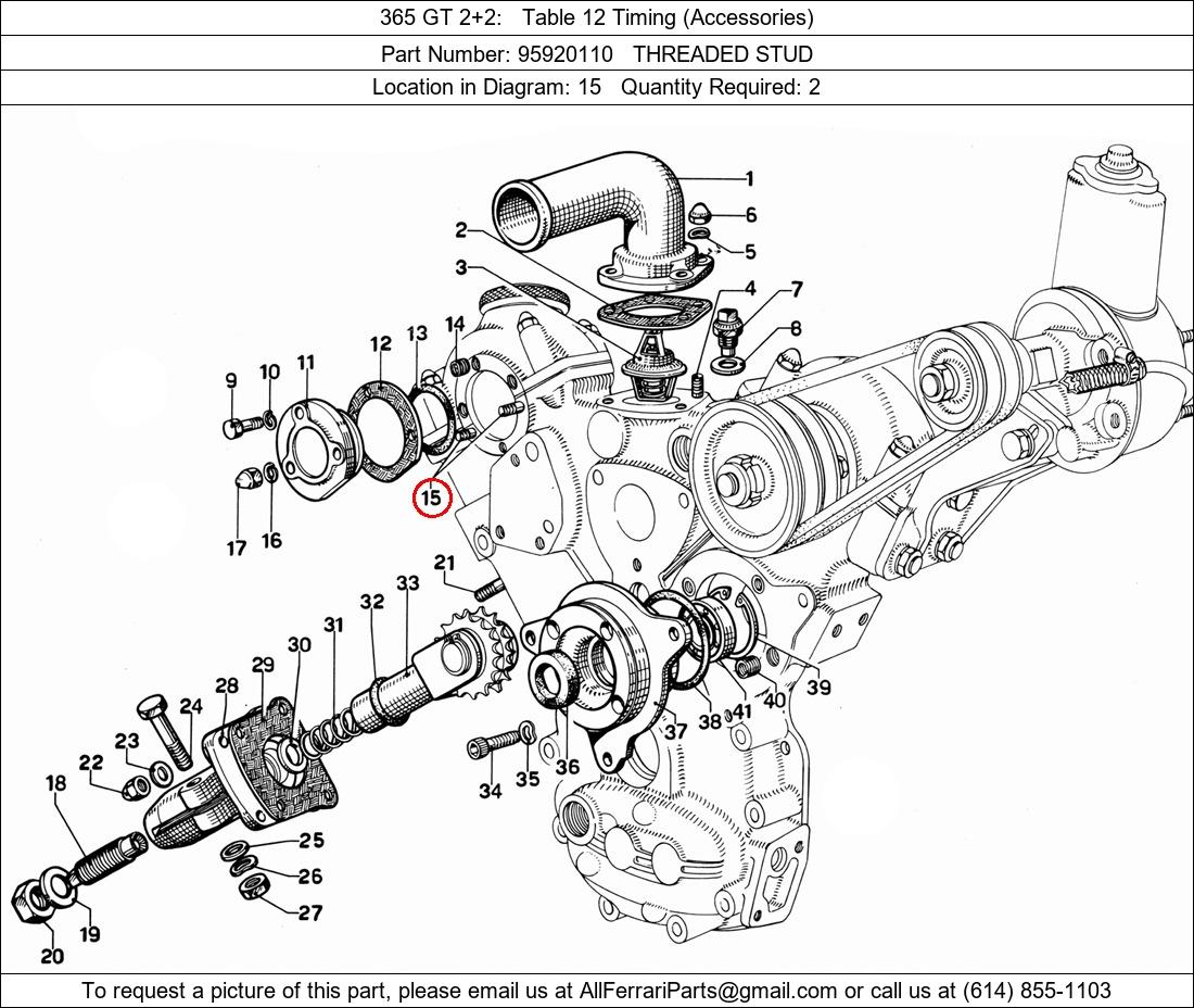 Ferrari Part Number 95920110, THREADED STUD shown here as used in 365 GT 2+2 Table 12 Timing (Accessories). Location in Diagram: 15. Required Quantity: 2. This Ferrari part is used in more than one diagram. Click on the diagrams below to see alternative uses of this part:
