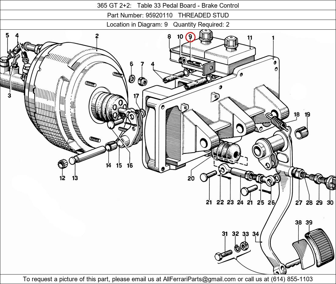 Ferrari Part Number 95920110, THREADED STUD shown here as used in 365 GT 2+2 Table 33 Pedal Board - Brake Control. Location in Diagram: 9. Required Quantity: 2. This Ferrari part is used in more than one diagram. Click on the diagrams below to see alternative uses of this part: