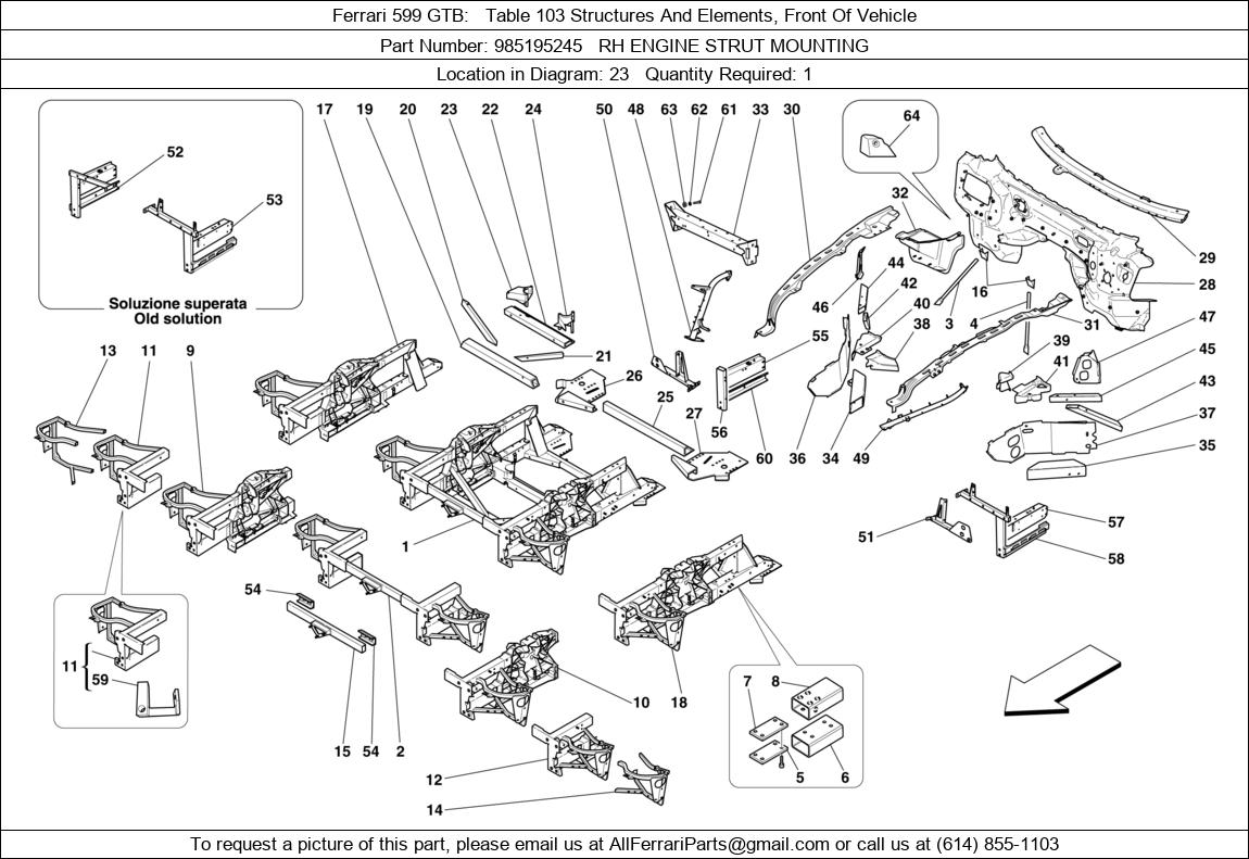 Ferrari Part 985195245, RH ENGINE STRUT MOUNTING, shown here as used in Ferrari 599 GTB Table 103 Structures And Elements, Front Of Vehicle. Other uses of this part are shown below: