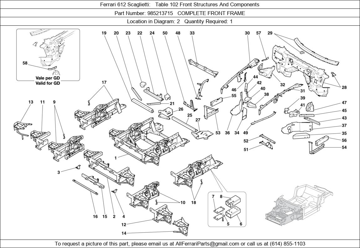 Ferrari Part 985213715, COMPLETE FRONT FRAME, shown here as used in Ferrari 612 Scaglietti Table 102 Front Structures And Components. Other uses of this part are shown below: