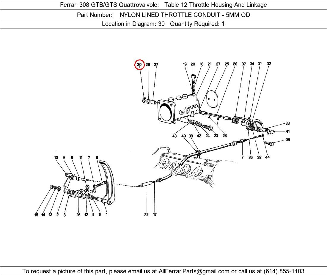 Ferrari Part Number 0, NYLON LINED THROTTLE CONDUIT - 5MM OD shown here as used in Ferrari 308 GTB/GTS Quattrovalvole Table 12 Throttle Housing And Linkage. Location in Diagram: 30. Required Quantity: 1