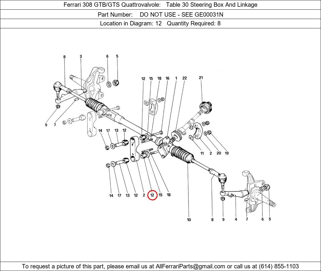 Ferrari Part Number 0, DO NOT USE - SEE GE00031N shown here as used in Ferrari 308 GTB/GTS Quattrovalvole Table 30 Steering Box And Linkage. Location in Diagram: 12. Required Quantity: 8