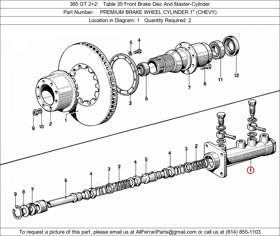 Ferrari Part Number 0, PREMIUM BRAKE WHEEL CYLINDER 1" (CHEVY) shown here as used in 365 GT 2+2 Table 35 Front Brake Disc And Master-Cylinder. Location in Diagram: 1. Required Quantity: 2