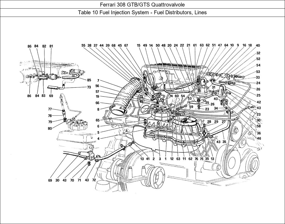 > Ferrari Parts 308 GTB/GTS Quattrovalvole Table 10 Fuel Injection System - Fuel Distributors, Lines Parts