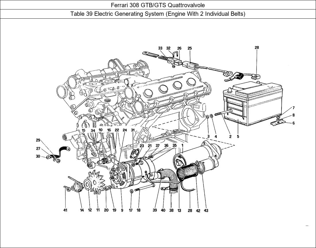 > Ferrari Parts 308 GTB/GTS Quattrovalvole Table 39 Electric Generating System (Engine With 2 Individual Belts) Parts