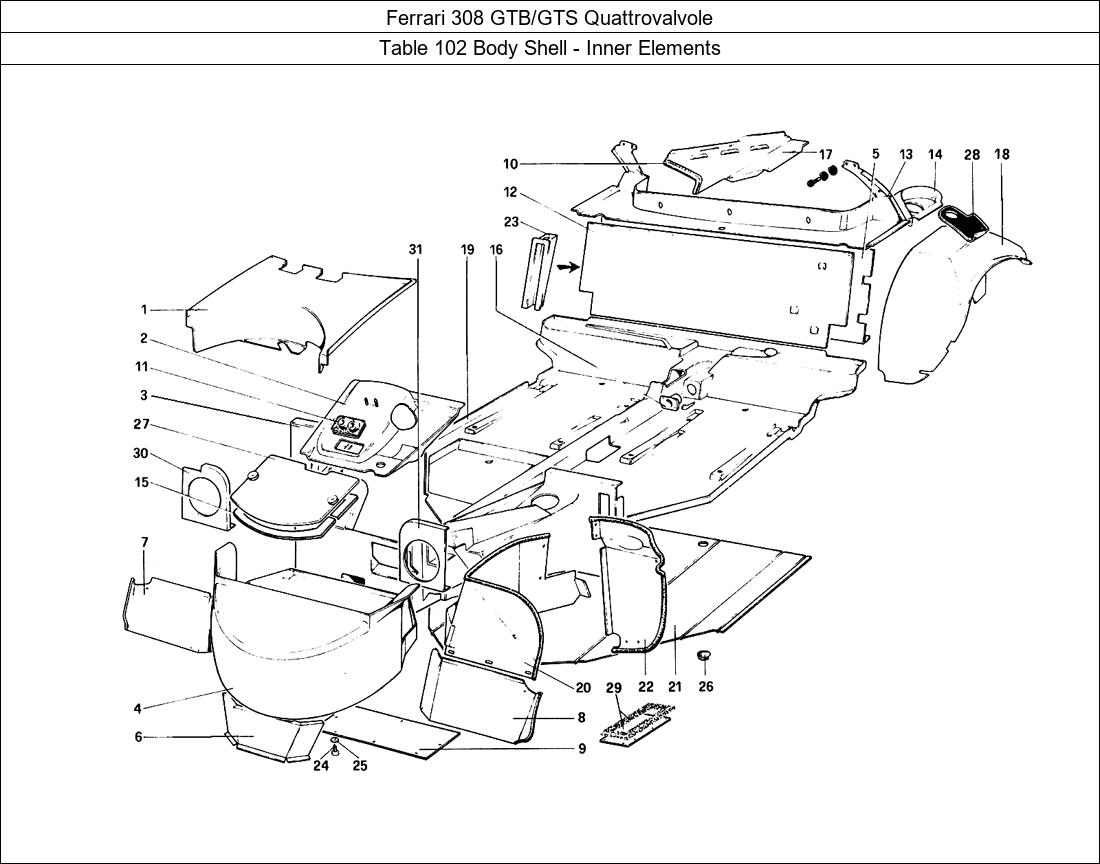 Ferrari Parts 308 GTB/GTS Quattrovalvole Table 102 Body Shell - Inner Elements Parts